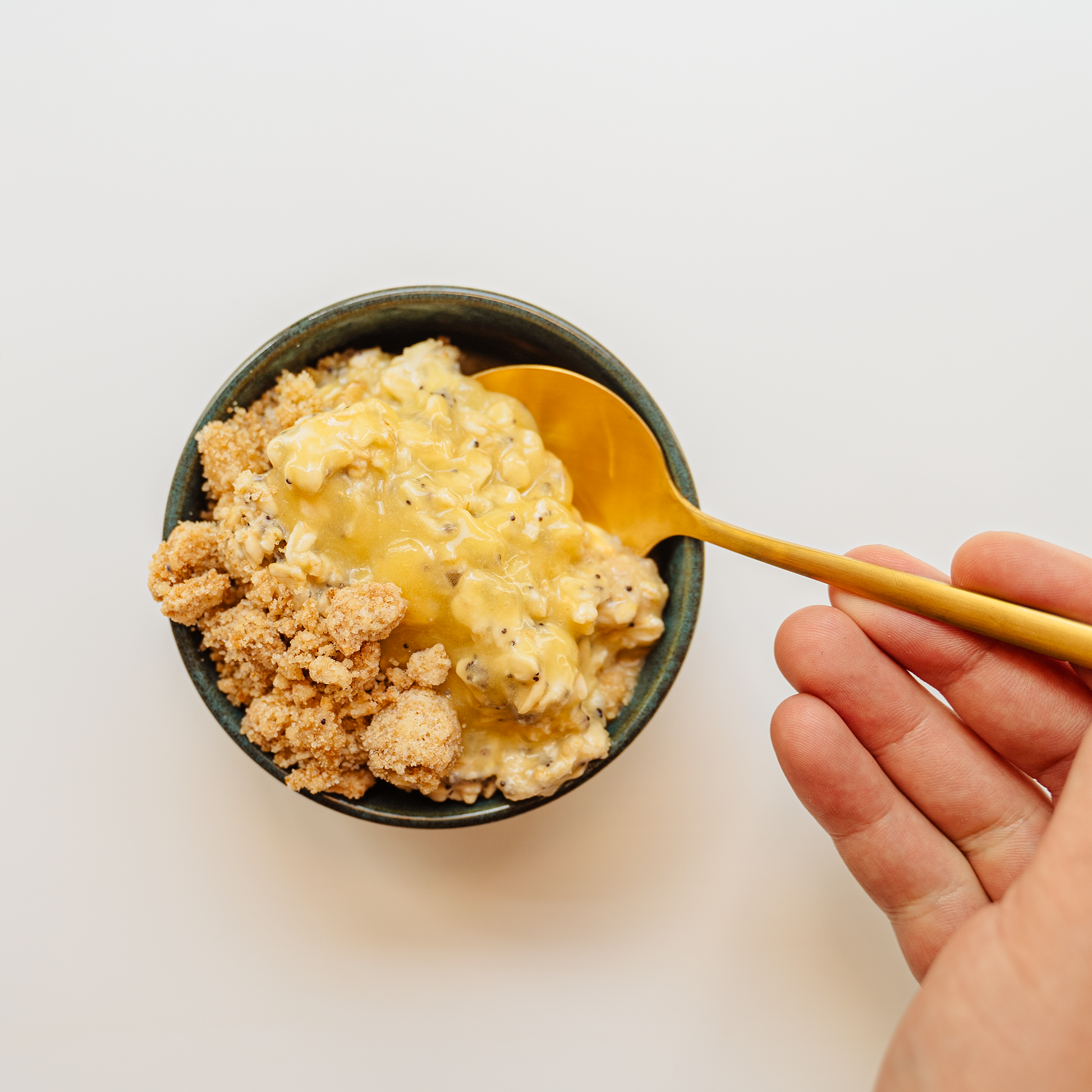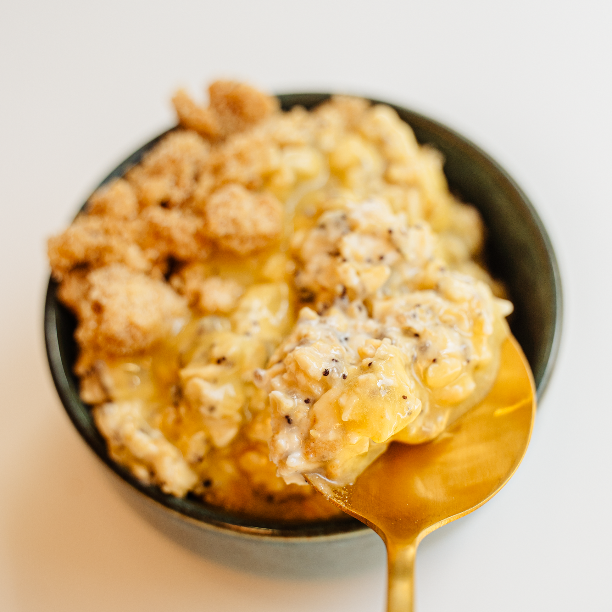 A nutritious blend of oats, chia seeds, poppy seeds, and zesty lemon zest soaked overnight in milk. Layered over a tangy lemon curd and finished with a delightful crunchy crumble topping. This refreshing and satisfying breakfast provides a burst of flavours and delightful textures.